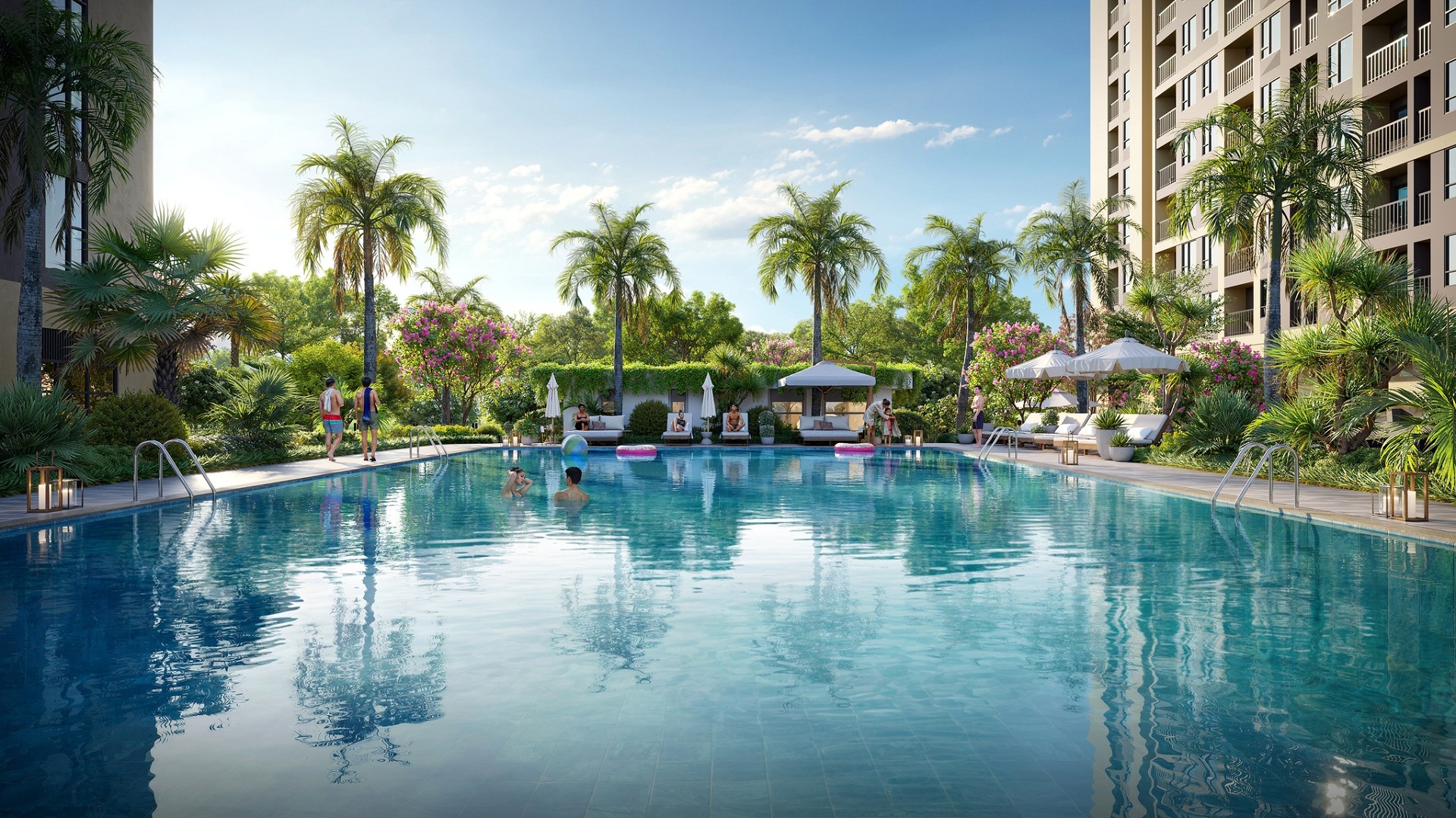 Môi trường sống xanh, tiện nghi khép kín: Không gian sống hiện đại mật độ xây dựng chỉ 29%, ưu tiên cây xanh cùng hệ tiện ích như bể bơi, công viên nhạc nước, khu vui chơi trẻ em